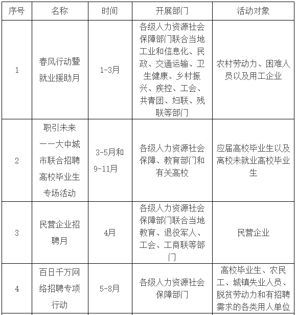 (四)百日千萬(wàn)網(wǎng)絡(luò)招聘專(zhuān)項(xiàng)行動(dòng)。5-8月,以高校畢業(yè)生、農(nóng)民工、城鎮(zhèn)失業(yè)人員、脫貧勞動(dòng)力和有招聘需求的各類(lèi)用人單位為重點(diǎn)對(duì)象,由各級(jí)人力資源社會(huì)保障部門(mén)牽頭開(kāi)展,搭建全國(guó)統(tǒng)一、多方聯(lián)動(dòng)的網(wǎng)絡(luò)招聘平臺(tái),以優(yōu)質(zhì)高效服務(wù)助推穩(wěn)就業(yè)保就業(yè)。