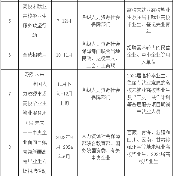 (八)職引未來(lái)——中央企業(yè)面向西藏青海新疆高校畢業(yè)生專(zhuān)場(chǎng)招聘活動(dòng)。2023年9月-2024年6月,以西藏、青海、新疆和四川、云南、甘肅涉藏州縣等地未就業(yè)高校畢業(yè)生、2024屆高校畢業(yè)生為重點(diǎn)對(duì)象,由人力資源社會(huì)保障部聯(lián)合教育部、國(guó)務(wù)院國(guó)資委、有關(guān)中央企業(yè)開(kāi)展,舉辦專(zhuān)場(chǎng)招聘活動(dòng)。