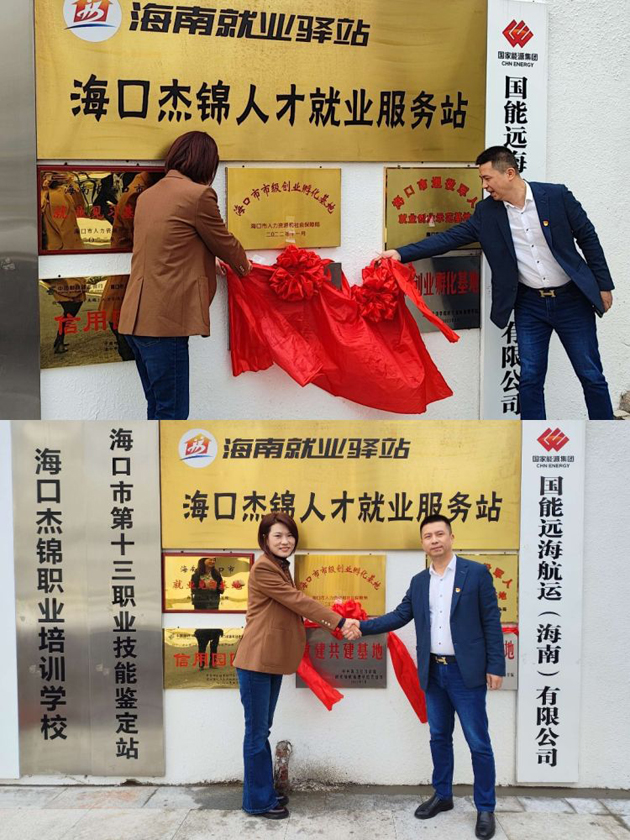 海口經(jīng)濟學(xué)院時代旅航管理學(xué)院黨總支書記石洪凡和??谑校ń苠\)人力資源服務(wù)產(chǎn)業(yè)園總經(jīng)理劉昕暉共同揭牌。