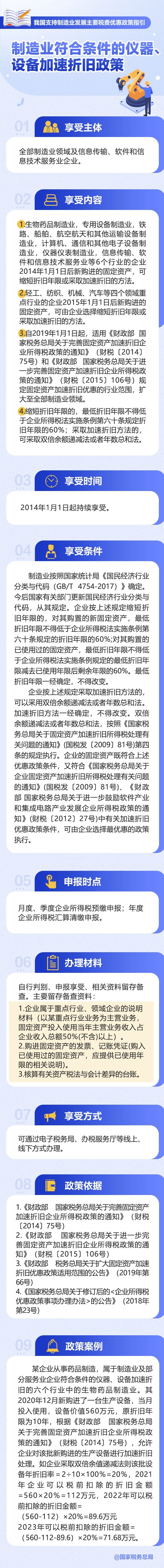 制造業(yè)是立國之本、強國之基,是實體經(jīng)濟的重要組成部分。中央經(jīng)濟工作會議指出,“落實好結構性減稅降費政策,重點支持科技創(chuàng)新和制造業(yè)發(fā)展”。為使大家更加全面熟悉了解政策、更加高效準確適用政策,財政部、國家稅務總局近日發(fā)布《我國支持制造業(yè)發(fā)展主要稅費優(yōu)惠政策指引》。今天帶你了解:制造業(yè)符合條件的儀器、設備加速折舊政策↓
