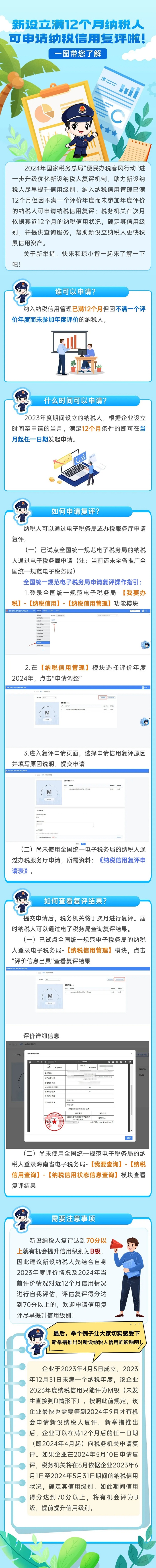 新設(shè)立滿12個(gè)月納稅人可申請(qǐng)納稅信用復(fù)評(píng)啦!一圖帶您了解