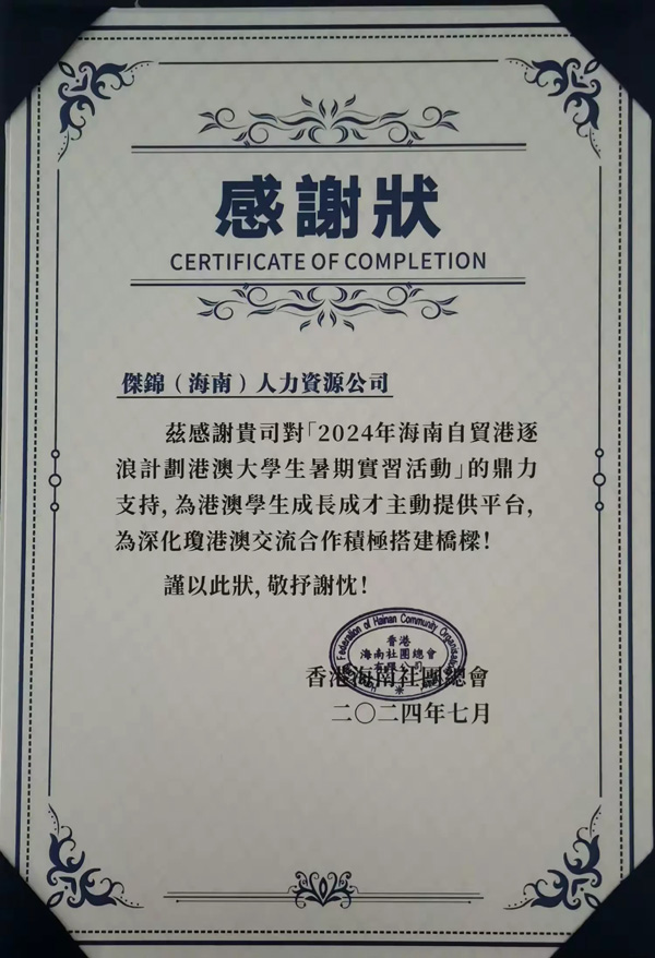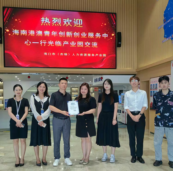 為積極響應(yīng)由海南省政府港澳事務(wù)辦公室、香港海南社團(tuán)總會(huì)主辦,海南港澳青年創(chuàng)新創(chuàng)業(yè)服務(wù)中心、大學(xué)國(guó)事學(xué)會(huì)承辦的2024年海南自貿(mào)港“逐浪計(jì)劃”港澳大學(xué)生暑期實(shí)習(xí)活動(dòng)(以下簡(jiǎn)稱“逐浪計(jì)劃”),??谑校ń苠\)人力資源服務(wù)產(chǎn)業(yè)園利用自身平臺(tái),向香港大學(xué)生提供了就業(yè)實(shí)習(xí)的崗位,8月6日上午,海南港澳青年創(chuàng)新創(chuàng)業(yè)服務(wù)中心對(duì)外事務(wù)經(jīng)理許妙琦一行代香港海南社團(tuán)總會(huì)向園區(qū)頒發(fā)感謝狀。