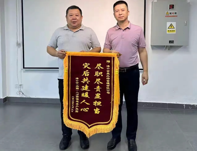 為感謝??跁构鲈趫@區(qū)臺風(fēng)過后重修重建工作的積極配合和幫助,9月29日,海口市(杰錦)人力資源產(chǎn)業(yè)園總經(jīng)理劉昕暉特代表園區(qū)全體向??跁构鲑浰湾\旗。